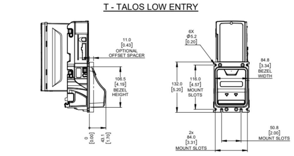 | T | Bezel / Configuration | Talos Low-Entry T-Bezel — compact up-stacker design for vending and amusement cabinets. |